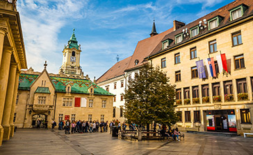 Das Michaelertor & der Turm: Das einzige (von insgesamt 4) erhaltene Tor der mittelalterlichen Stadtmauer stammt aus dem 14. Jahrhundert. Sein emblematischer Barockturm wird von einer riesigen Statue des Heiligen Michael mit dem Drachen (1758) geschmückt und beherbergt heute ein kleines Militärmuseum und Dokumente zur Geschichte der Stadtmauern. Der Balkon an der Spitze des Turms (51 Meter hoch) bietet einen einzigartigen Blick auf die Altstadt und die Burg Bratislava. Auf dem Bürgersteig vor dem Tor befindet sich Bratislavas „Nullpunkt“, an dem die kilometerlangen Entfernungen zu den wichtigsten europäischen Hauptstädten aufgezeichnet sind.