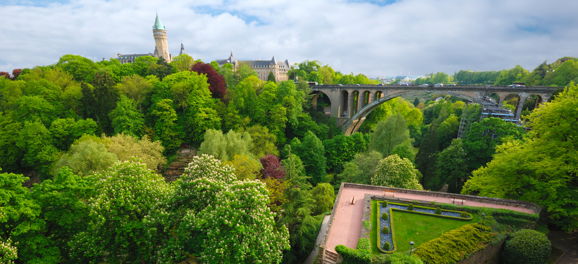 Place de la Constitution: Ein weiterer herrlicher Logenplatz von Luxemburg mit einem phantastischen Blick auf die historische Adolphe-Brücke und die Schlucht des Flusses Pétrusse. Auf der Mitte des Platzes steht eine riesige Säule mit der Statue der Goldenen Frau (Gëlle Fra, 1923), das Nationalsymbol der Freiheit und Ehrenmal der Gefallenen im Ersten Weltkrieg.